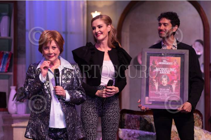 Pati Chapoy, Benny Ibarra y Chantal Andere asistieron como padrinos al homenaje que se le rindió a la primera actriz Jacqueline Andere por su trayectoria, en la obra "100 m2 o el Inconveniente".