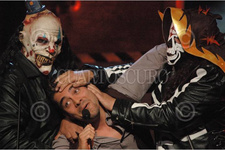 MÉXICO D.F., 07OCTUBRE2011.- El comediante Omar Chaparro y los luchadores “Misterio” y “La Parca” participaron la noche de ayer en la entrega de los MTV Games Awards que premia a los mas destacado en el diseño de videojuegos. FOTO: FRANCISCO RODRÍGUEZ/CUARTOSCURO.COM