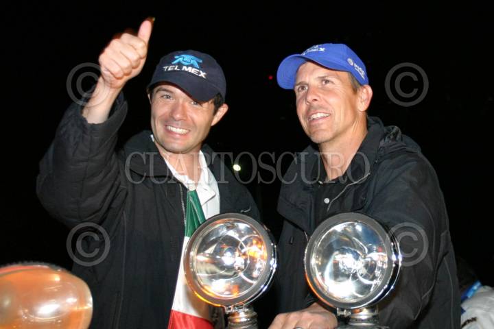 MÉXICO D.F. 04MARZO2006.- Luis el "Chapulin" Díaz, junto con su coequipero Scott Pruett, de la escuderia Chip Ganassi, durante la celebración en el Ángel tras la victoria de la categoria Gran Am, en el Autodrómo de los Hermanos Rodríguez. FOTO: Rocío Ortiz/CUARTOSCURO.COM