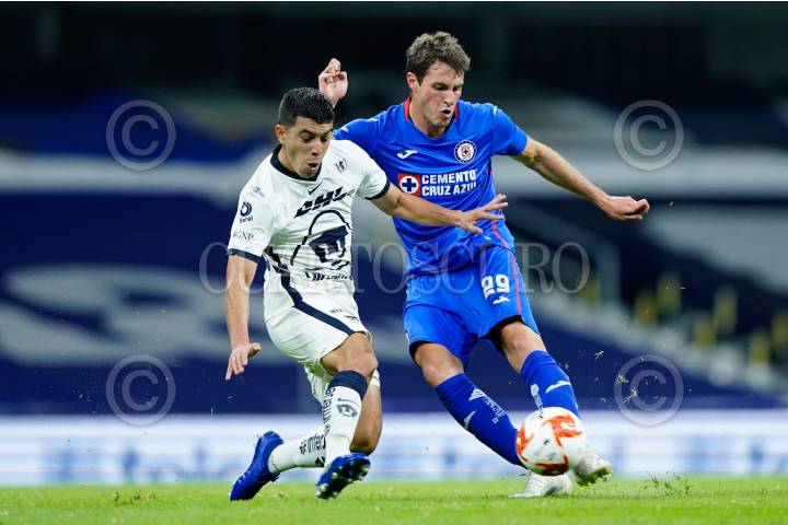 Santiago Giménez, delantero del Cruz Azul, recorta a un zaguero, en el partido que su escuadra cayó ante Pumas, 2-1.