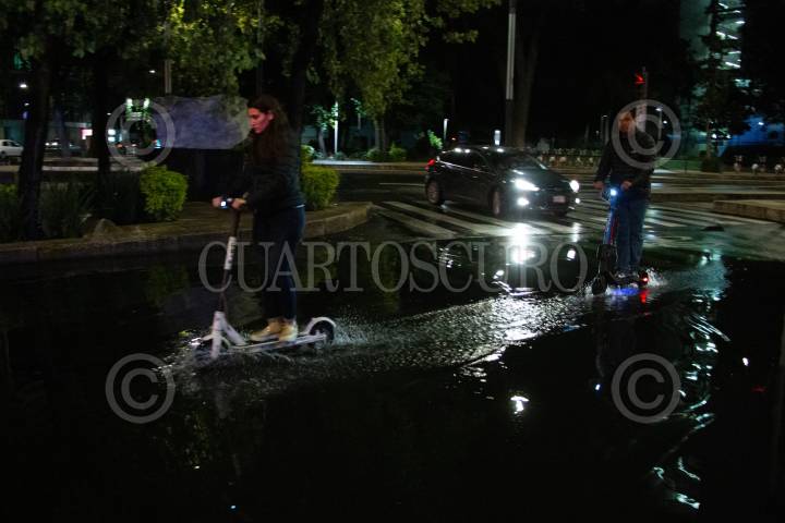 CIUDAD DE MÉXICO, 28JULIO2019.- Debido a las fuertes lluvias de este domingo, algunas de las principales vías vehiculares como Paseo de la Reforma sufrieron de encharcamientos. En imagen, usuarios de scooters conducen en medio de un charcho. FOTO: ROGELIO MORALES /CUARTOSCURO.COM