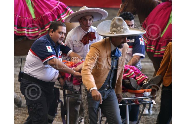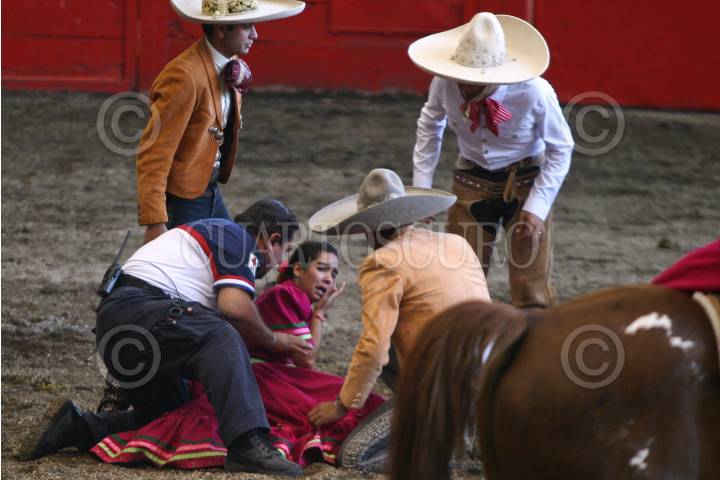 MÉXICO D.F., 02OCTUBRE2008.- Una escaramuza cayo de un caballo durante la Charreada de Honor por la visita de los Príncipes de Asturias, Felipe de Borbón y Grecia Letizia Ortiz que se realizo en el Lienzo Charro de Constituyentes. FOTO: RODOLFO ANGULO/CUARTOSCURO.COM