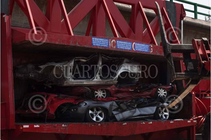 Una grúa arroja el vehículo destruido al molino.