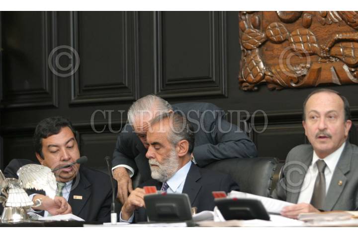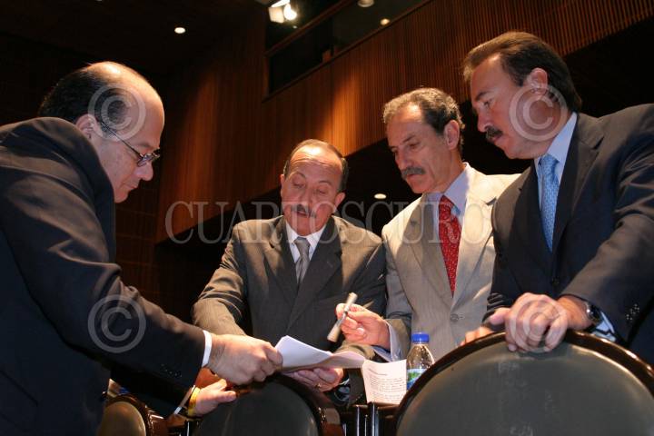 MEXICO, D.F. 05ENERO2005.- Cesar Ojeda, senador del PRD y Carlos Chaurad, Francisco Gil Elorduy y Emilio Gamboa Patrón, senadores del PRI, durante la sesión de la comisión permanente en San Lázaro. FOTO: Moisés Pablo/CUARTOSCURO.COM