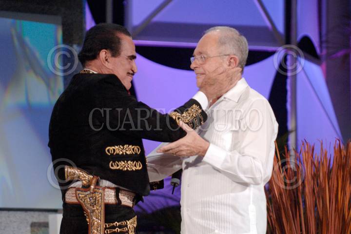 ACAPULCO,GUERRERO 19OCTUBRE2006.- El ex conductor Raúl Velasco recibió un homenaje por su trayectoria y el apoyo que le brindó a los artistas. El cantante Vicente Fernández fue una de las celebridades que acompañó al homenajeado. FOTO: TELEVISA/CUARTOSCURO.COM