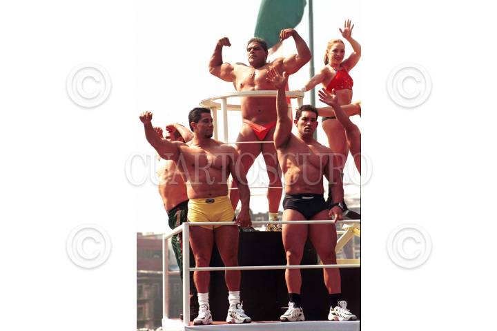 El grupo de fisicoconstructivistas, durante el tradicional desfile deportivo en el Zócalo Capitalino. FOTO: VIctoria Valtierra/CUARTOSCURO.COM