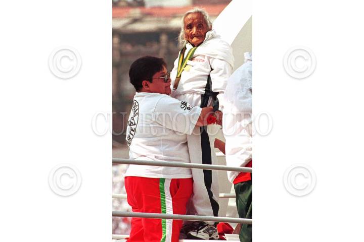 México, D.F., 15JUNIO2004.- Rosario Iglesias, mejor conocida como "Doña Chayito", fue la última en portar la flama olímpica durante su recorrido por la Ciudad de México. FOTO: Moisés Pablo/CUARTOSCURO.COM