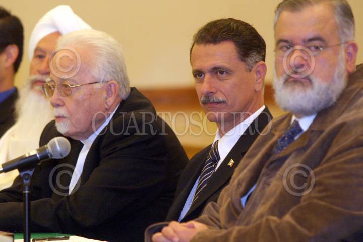 MEXICO, D.F., 17NOVIEMBRE2005.- Arjan Sigh Salmerón, Iglesia Sikh, Antonio Chedrahui, Iglesia Ortodoxa y Carlos María Abascal, Secretario de Gobernación, durante la celebración del Día Internacional de la Tolerancia, en la SEGOB. FOTO: Moisés Pablo/CUARTOSCURO.COM