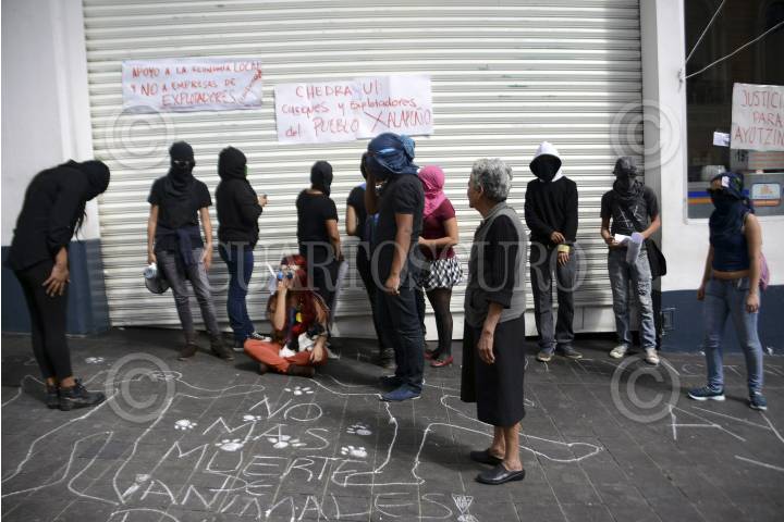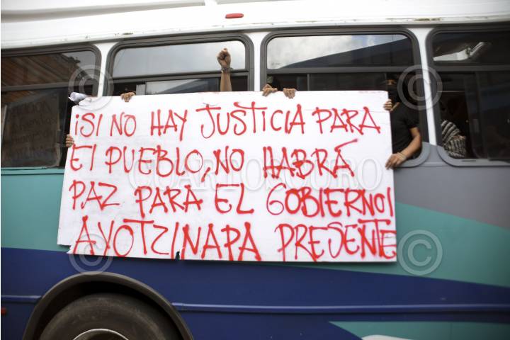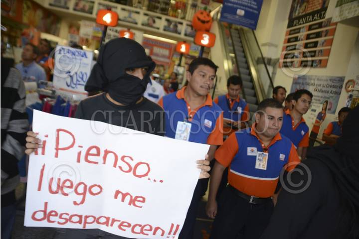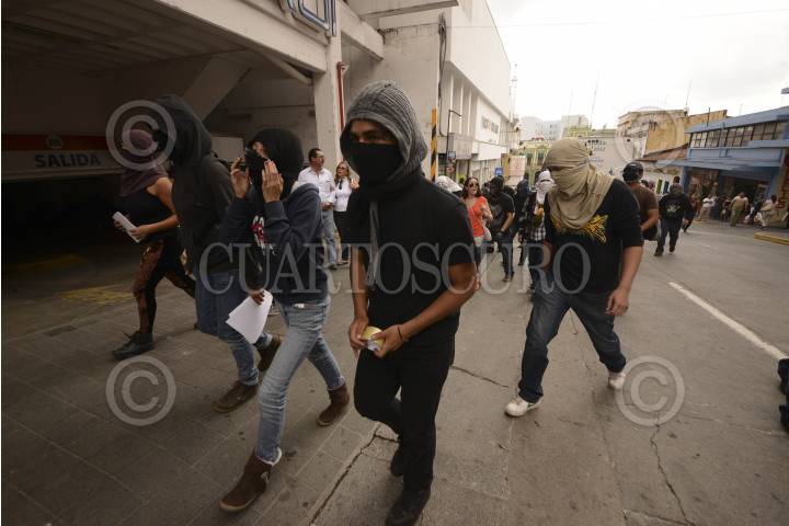 XALAPA, VERACRUZ 29OCTUBRE14.- Estudiantes de diferentes facultades de la UV arribaron en un autobús de la universidad a la calle de Lucio en el centro de la ciudad para tomar pacifica y simbólicamente la tienda Chedraui, demandando la aparición con vida de los 43 normalistas desaparecidos en Ayotzinapa, Guerrero. Los encargados de la tienda departamental cerraron rápidamente la cortina del inmueble para impedir el paso a los manifestantes dejando encerrados a los clientes quienes se quejaron y acusaron de rapto al supermercado. Mientras tanto, en la acera de enfrente, los estudiantes tomaron almacenes Chedraui donde no permitieron la entrada a ninguna persona y entregaron dípticos con información sobre el caso de Guerrero a los ciudadanos. FOTO: RUBÉN ESPINOSA /CUARTOSCURO.COM