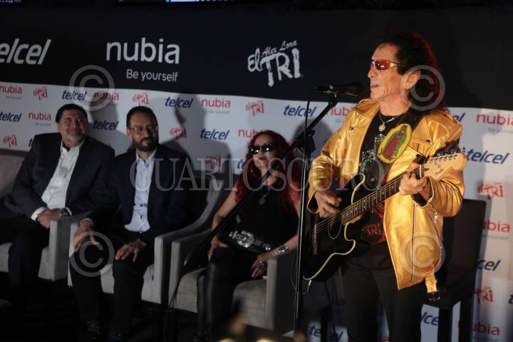 CIUDAD DE MÉXICO, 11JUNIO2025. Óscar Lara CEO de la marca Nubia, Marcos Linares Sub Director de mercadotecnia de Telcel, Chela Lora y el icónico roquero mexicano, Alex Lora durante la presentación del nuevo teléfono Nubia Music 2, con un diseño en colaboración con la banda de El Tri. FOTO: EDGAR NEGRETE LIRA/CUARTOSCURO.COM