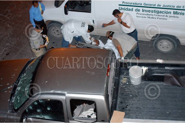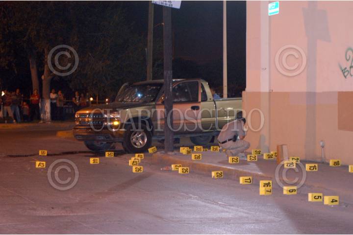 CIUDAD JUAREZ, CHIHUAHUA, 18SEPTIEMBRE2008.- La noche del 16 de septiembre fueron ejecutados de más de 80 disparos dos hombres que estaban a las afueras de una tienda de conveniencia, ubicada en la intersección de las calles Pedro Rosales de León y Simona Barba del fraccionamiento San Ángel, las victimas estaban a bordo de una camioneta Chevrolet Silverado de cabina y media. FOTO: ARCHIVO/BIENINFORMADO.COM/CUARTOSCURO.COM