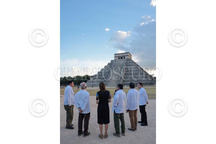 CHICHÉN ITZÁ, YUCATÁN, 13DICIEMBRE2024.- Claudia Sheinbaum, presidenta de México, durante su gira de trabajo en la entidad visitó la zona arqueológica de Chichén Itzá. La acompañaron: Joaquín Díaz Mena, gobernador de Yucatán; Diego Prieto, director general del INAH, y Mario Delgado, secretario de Educación Pública. FOTO: PRESIDENCIA/CUARTOSCURO.COM