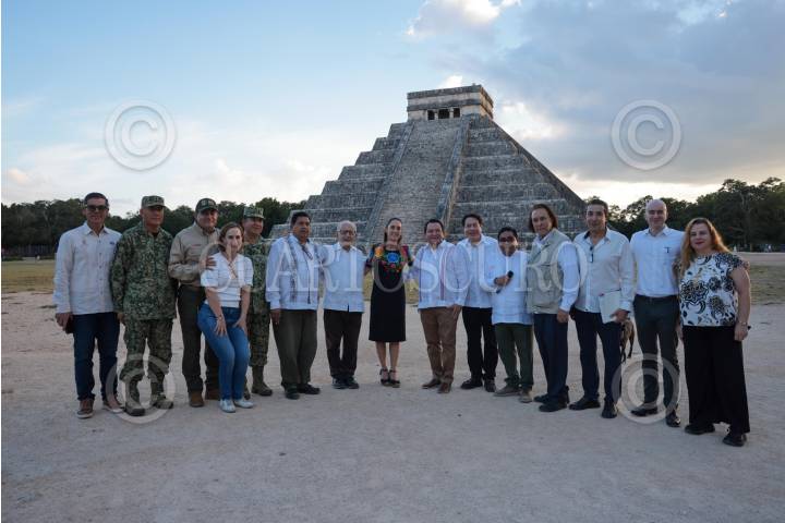 CHICHÉN ITZA, YUCATÁN, 19MAYO2025.- La secretaria de Turismo del Gobierno de México, Josefina Rodríguez Zamora, acompañada por más de 60 embajadoras y embajadores, realizó un recorrido a bordo del Tren Maya, donde les exhortó a sumarse a la promoción turística en sus países de representación. Acompañada de la subsecretaria para América Latina y El Caribe, Raquel Serur Smeke; del director general del Instituto Nacional de Antropología e Historia, Diego Prieto Hernández, y del gobernador de Yucatán, Joaquín Díaz Mena, Rodríguez Zamora expuso que el Tren Maya está acompañado de una red de servicios que lo fortalecen, genera empleos, protege el entorno natural y celebra la cultura viva de nuestros Pueblos Originarios, entre los que destacó los 7 hoteles administrados por el Grupo Aeroportuario, Ferroviario y de Servicios Auxiliares y Conexos, Olmeca-Maya-Mexica. FOTO: SECRETARÍA DE TURISMO/CUARTOSCURO.COM