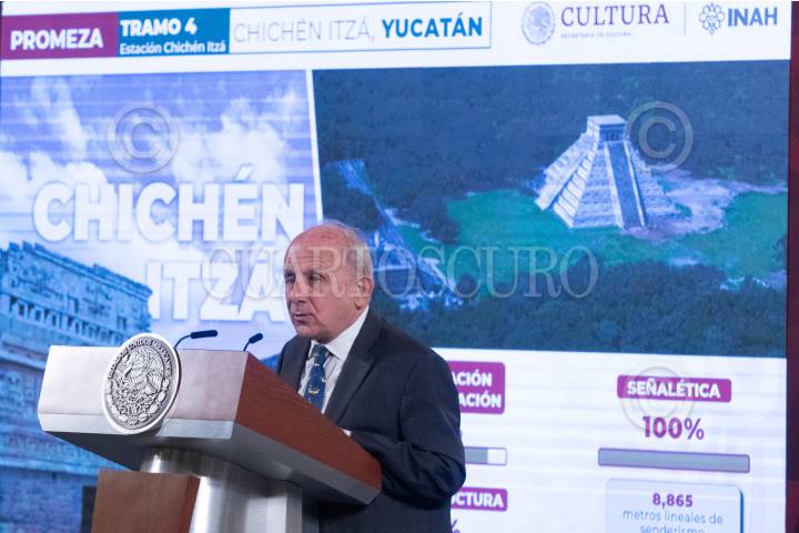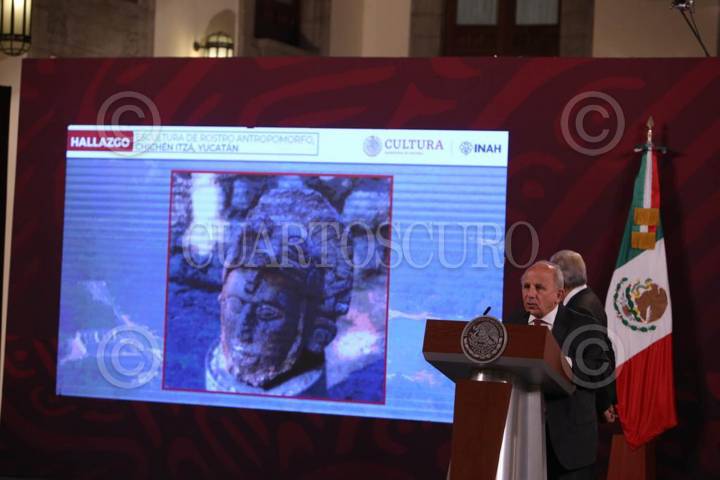 CIUDAD DE MÉXICO, 16OCTUBRE2023.- Diego Prieto Hernández, director general del Instituto Nacional de Antropología e Historia (INAH), habla sobre los proyectos de pa dona arqueológica de Chichén Itza en el largo de la construcción del Tren Maya, durante la mañanera. FOTO: MOISÉS PABLO/CUARTOSCURO.COM