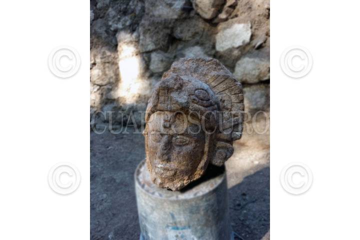 CHICHÉN ITZÁ, YUCATÁN, 09NOVIEMBRE2023.- Ceñido con un yelmo de serpiente con las fauces abiertas y un tocado de plumas, el rostro esculpido de un guerrero emergió durante las excavaciones que se efectúan con recursos del Programa de Mejoramiento de Zonas Arqueológicas (Promeza), en el llamado Templo 6 de Maudslay, perteneciente al conjunto Casa Colorada de Chichén Itzá, en el estado de Yucatán. El más reciente descubrimiento en “la ciudad al borde del pozo de los itzáes”, significado del nombre del sitio en lengua maya, fue dado a conocer en la conferencia matutina del presidente de México, Andrés Manuel López Obrador, por el director general del Instituto Nacional de Antropología e Historia (INAH), Diego Prieto Hernández, quien presentó los últimos reportes del salvamento arqueológico realizado en su fase conclusiva en las obras del Tren Maya. FOTO: INAH/CUARTOSCURO.COM