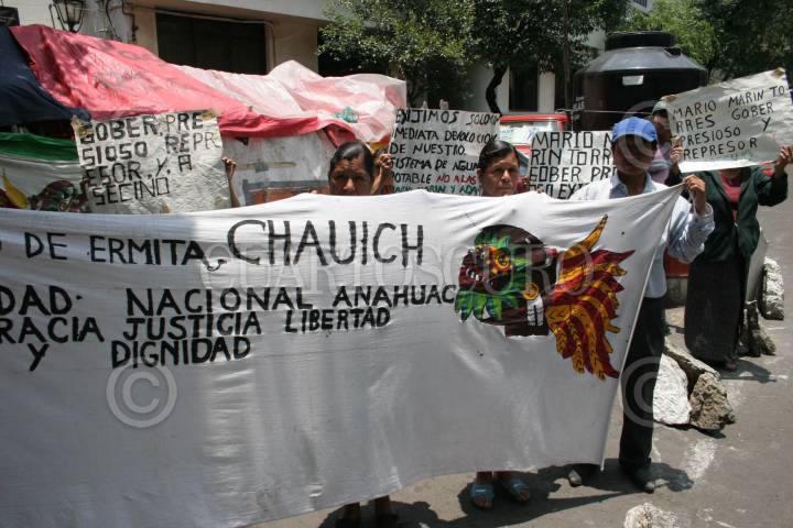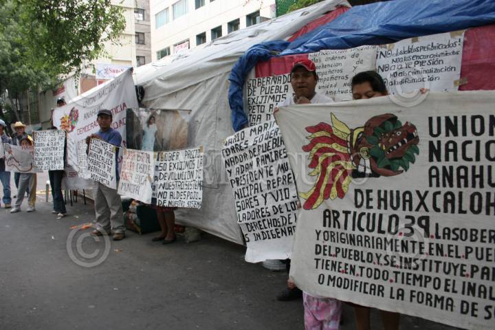 MÉXICO, D.F. 14MAYO2007.- Un grupo de varias comunidades de Huaxcaleca entre ellos los de Chichiquila en el estado de Puebla estan en plantón frente a las oficinas de la representación del gobierno del estado, en esta ciudad. Exigen atención de las autoridades estatales, para terminar con la violencia, que ejercen "casiques y policias locales" del PRI. Piden alto a la violencia el derecho a organizarse y a defender sus recursos naturales que les quieren arrebatar los hombres poderosos de la zona, entre ellos Marcelino Sedas González, Valentín Sedas González, Ageo Sedas Zacatlan y Fabio Sedas. FOTO: EZEQUIEL TLAXCALA/ CUARTOSCURO.COM
