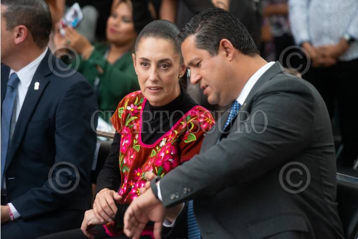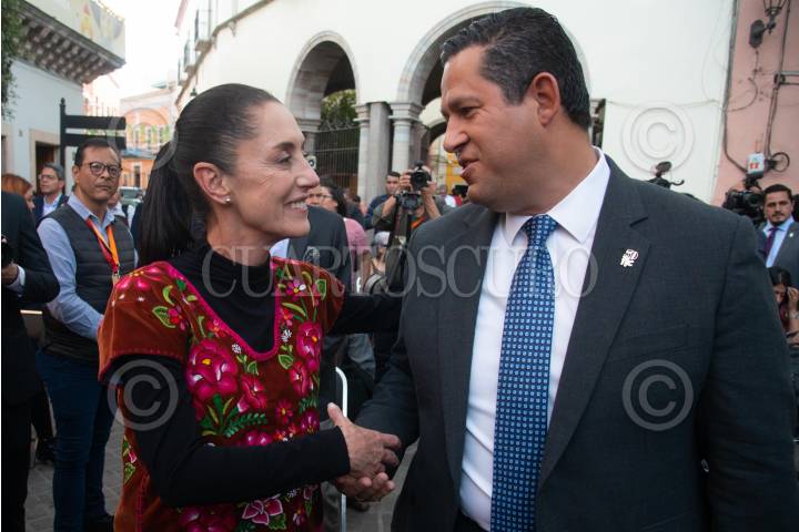 Claudia Sheinbaum, jefa de Gobierno, y Diego Sinhue Rodríguez, gobernador de Guanajuato, durante su llegada a la inauguración de la "Casa Ciudad de México, Casa Chilanga" la cual contará con diversas actividades culturales en el marco del 50 Festival Internacional Cervantino (FIC).