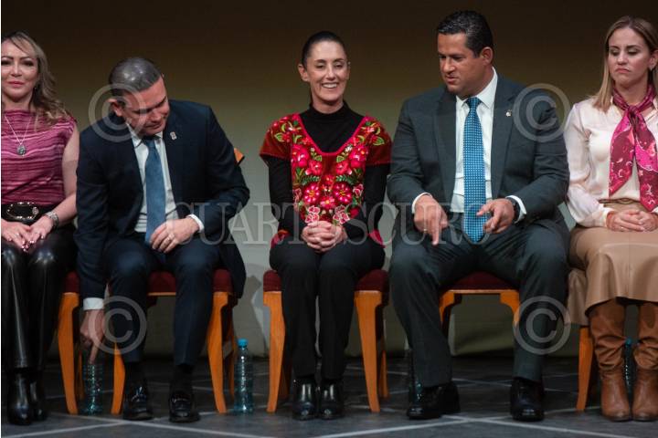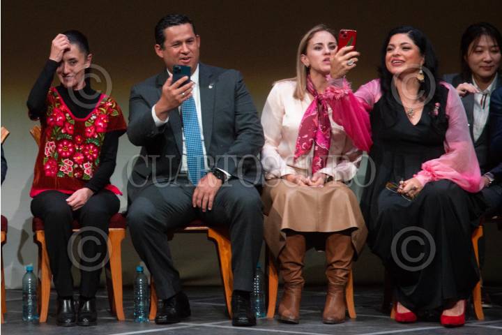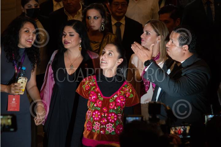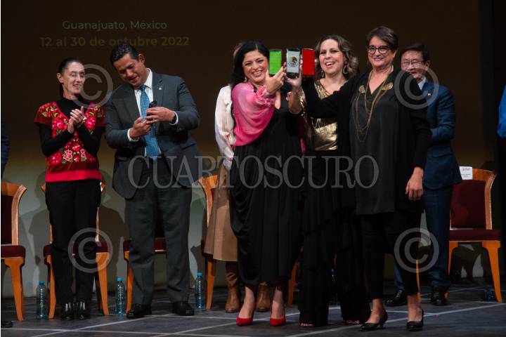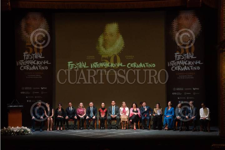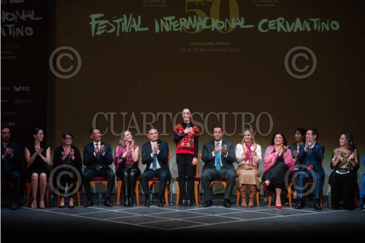 Claudia Sheibaum, jefa de Gobierno de la Ciudad de México; Alejandra Frausto, secretaria de Cultura Federal; Diego Sinhue Rodríguez, gobernador de Guanajuato; Luis Felipe Guerrero Agripino, rector de la Universidad de Guanajuato; Alejandro Navarro, presidente municipal de Guanajuato; Claudia Curiel de Icaza, secretaria de Cultura de la Ciudad de México, y Mariana Aymerich Ordoñez, directora general del Festival Internacional Cervantino (FIC), encabezaron la inauguración del 50 Festival Internacional Cervantino (FIC) realizado en el Teatro Juárez.