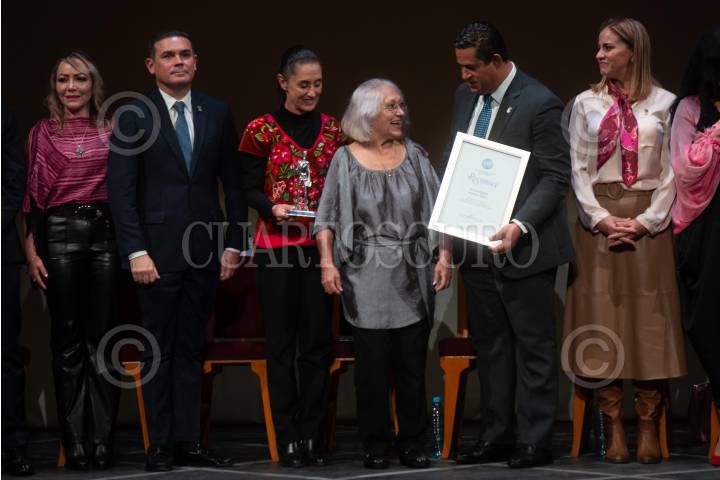 Rosa María Muñoz, periodista, recibe un reconocimiento a su trayectoria en manos de Diego Sinhue Rodríguez, gobernador de Guanajuato, durante la inauguración del 50 Festival Internacional Cervantino (FIC).