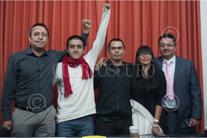 MÉXICO, D.F., 02DICIEMBRE2014.- Juan Daniel López y Lawrence Maxwell, quienes fueron detenidos el pasado 20 de noviembre por parte de la policía de manera arbitraria durante el desalojo en el zócalo después de la manifestación por el caso Ayotzinapa y que fueron liberados el pasado sábado por falta de pruebas, ofrecieron una conferencia de prensa para narrar la forma en que fueron detenidos y golpeados por policías federales y capitalinos, de igual manera refirieron como fueron torturados física y psicológicamente en los traslados a la SEIDO y al penal de Villa Aldama, Veracruz. Durante la conferencia fueron acompañados por los abogados Karla Michel Salas, David Peña y Armando Barrera, quienes hablaron sobre las acciones penales del caso. FOTO: DIEGO SIMÓN SÁNCHEZ /CUARTOSCURO.COM