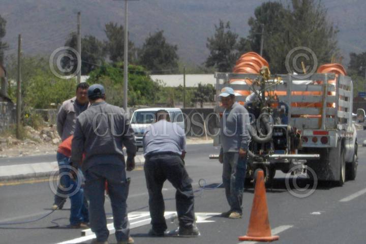 CHILPANCINGO, GUERRERO, 18ABRIL2006.- Trabajadores de la SCT pintan señalizaciones en el bulevar Chilpancingo-Petaquillas, el cual sera inaugurado de manera oficial el proximo jueves, por el secretario de comunicaciones y transportes Pedro Cerisola y Weber, el gobernador del estado Zeferino Torreblanca Galindo y el alcalde de Chilpancingo Mario Moreno Arcos. FOTO: Oscar Alvarado/CUARTOSCURO.COM