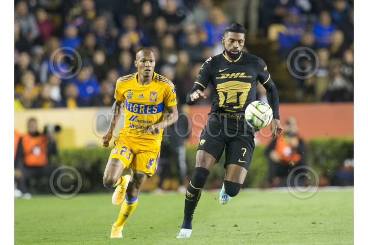 Luis Quiñones de Tigres, se disputa el balón con Diogo De Oliveira de Pumas, en el estadio Universitario, partido correspondiente a la jornada 6 de la Liga MX, Clausura 2023.