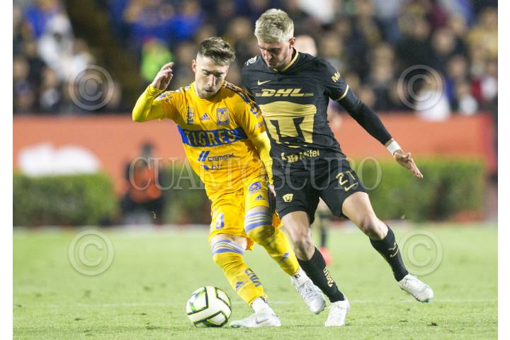 Diego Reyes de Tigres, se disputa el balón con Gustavo Del Prete de Pumas, en el estadio Universitario, partido correspondiente a la jornada 6 de la Liga MX, Clausura 2023.