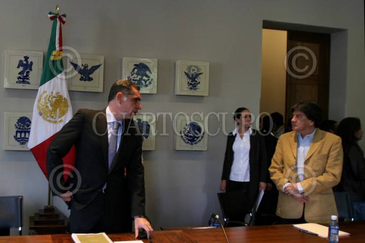OAXACA, OAXACA, 11NOVIEMBRE2011.- Gabino Cué, gobernador del estado acompañado de Jesús Martínez Álvarez, secretario general de Gobierno (Segego) encabezaron la "Instalación de la Comisión Ejecutiva para la Atención de los Chimalapas", acto realizado en el Salón de los Escudos del Palacio de Gobierno al que asistieron los delegados Federales de la Reforma Agraria, Sagarpa, PGR, entro otros, no así representantes de San Miguel Chimalapa. FOTO: ARTURO PÉREZ ALFONSO/CUARTOSCURO.COM