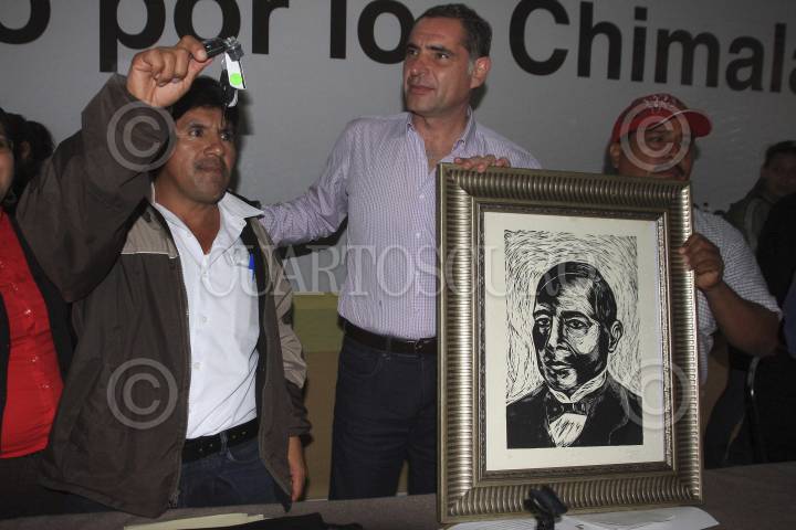 SAN MIGUEL CHIMALAPA, OAXACA, 07DICIEMBRE2011.- El presidente de Bienes Comunales de San Miguel Chimapalas, Alberto Cruz Gutiérrez (izq.), entregó al gobernado, Gabino Cué un cuadro de BEnito Juárez, esto tras citar al benemérito, "malditos aquellos que con sus palabras defienden a su pueblo, pero con sus hechos lo traicionan" FOTO: ARTURO PEREZ ALFONSO/CUARTOSCURO.COM
