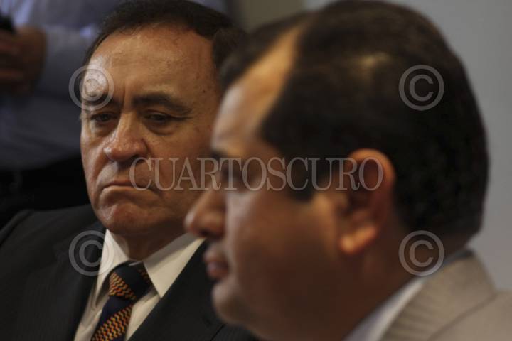 OAXACA, OAXACA 17AGOSTO2012.- Jesús Martínez Álvarez, secretario General de Gobierno (Segego), y Obdulio Ávila Mayo, subsecretario de Gobernación (Segob) durante la conferencia de prensa para tratar el conflicto limítrofe entre Oaxaca y Chiapas, por la región de los Chimalapas. Ávila Mayo aseguró que el problema esta siendo atendido, pero que este no será resuleto en tanto no exista un acuerdo conciliatorio. FOTO: JORGE ARTURO PÉREZ ALFONSO /CUARTOSCURO.COM
