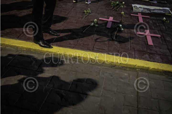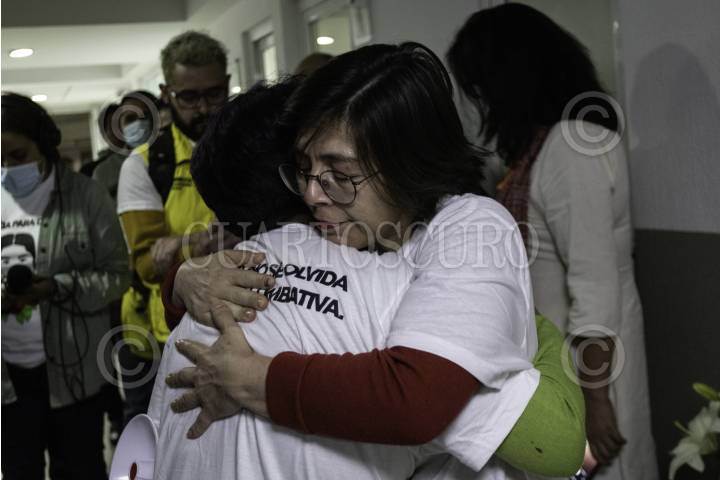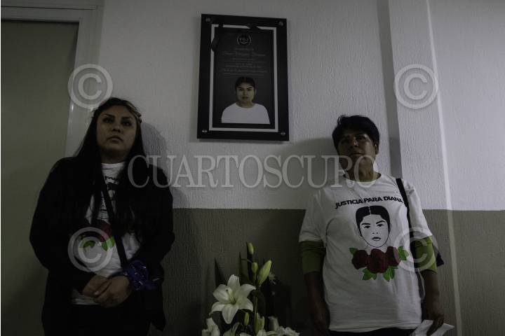Lidia Florencio y Laura Florencio madre y hermana de Diana joven víctima de feminicidio en 2017 durante la colocación de una placa en el Semefo de la Fiscalía de Chimalhuacán como parte de las medidas de reparación por la mala diligencia que realizó esta instancia en el caso de Diana Velázquez Florencio.