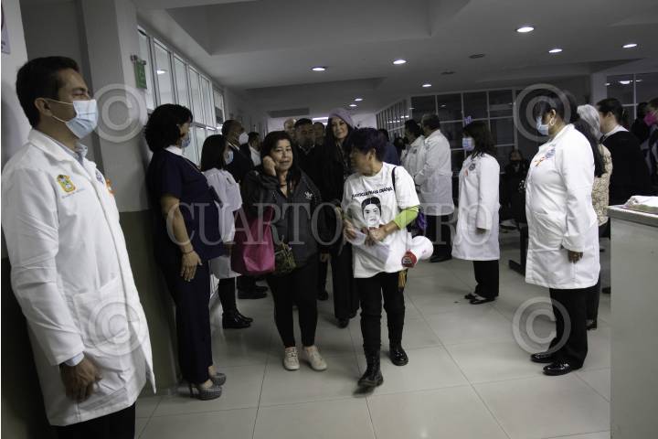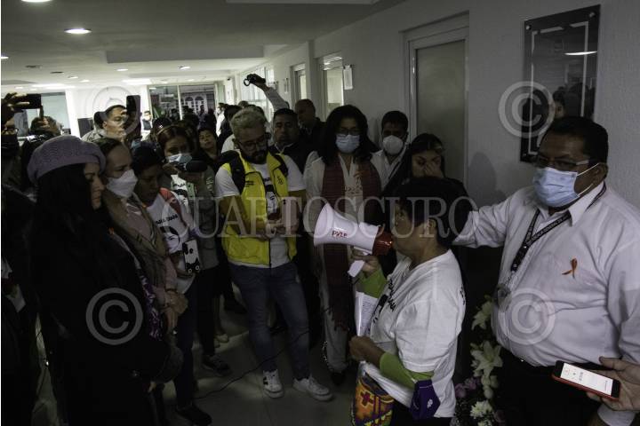 Lidia Florencio y Laura Florencio madre y hermana de Diana joven víctima de feminicidio en 2017, Dilcya García Espinoza, fiscal Central para la atención de Delitos vinculados a la violencia y Martha Hilda, titular de la Secretaria de mujeres del Estado de México durante la colocación de una placa en el Semefo de la Fiscalía de Chimalhuacán como parte de las medidas de reparación por la mala diligencia que realizó esta instancia en el caso de Diana Velázquez Florencio.