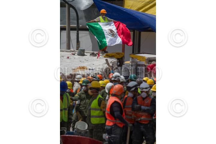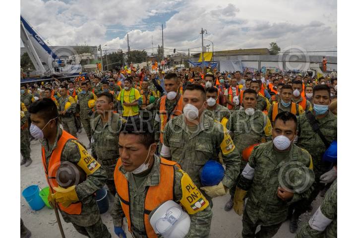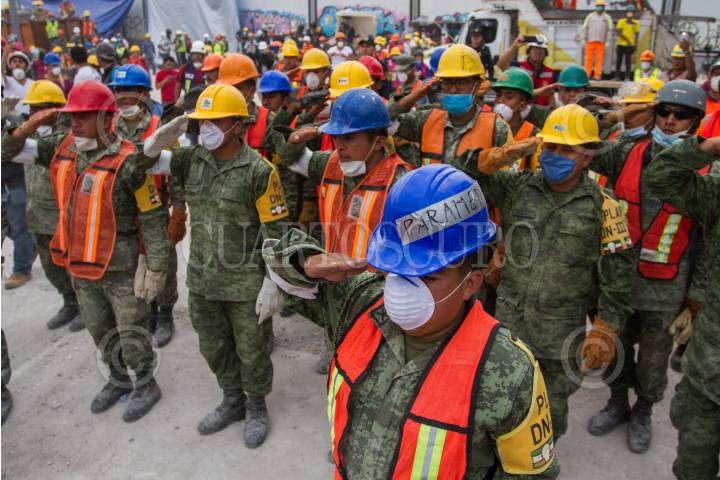 CIUDAD DE MÉXICO, 22SEPTIEMBRE2017.- Sociedad civil, rescatistas y elementos del Ejército terminaron de remover escombros en el edificio que colapsó en la calle de Chimalpopoca, en la colonia Obrera, luego del sismo de 7.1 grados Richter. Elementos del ejército entonaron el himno nacional y guardaron un minuto de silencio al terminar de retirar los escombros. FOTO: ISAAC ESQUIVEL /CUARTOSCURO.COM