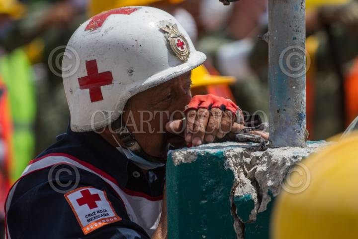 CIUDAD DE MÉXICO, 22SEPTIEMBRE2017.- Sociedad civil, rescatistas y elementos del Ejército terminaron de remover escombros en el edificio que colapsó en la calle de Chimalpopoca, en la colonia Obrera, luego del sismo de 7.1 grados Richter. En la imagen, un rescatista de la Cruz Roja toma un descanso. FOTO: ISAAC ESQUIVEL /CUARTOSCURO.COM