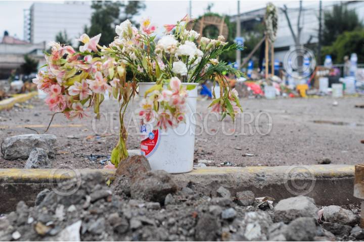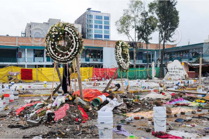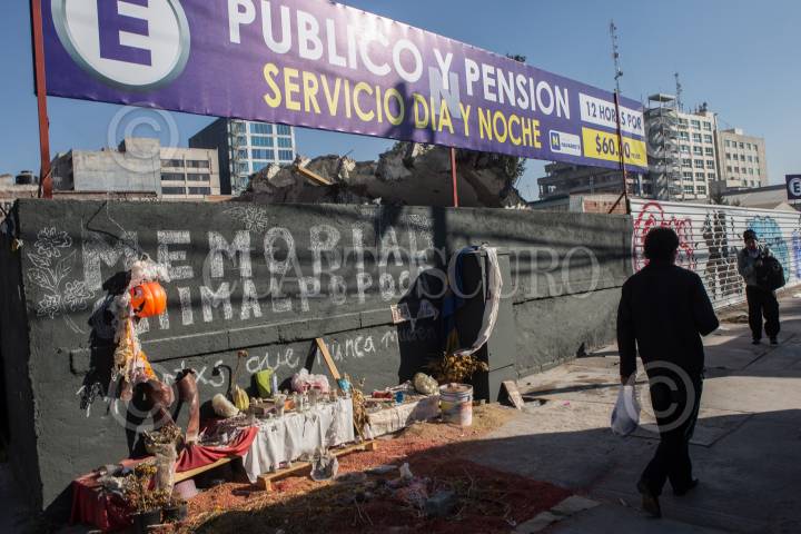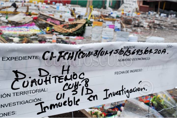 CIUDAD DE MÉXICO, 30SEPTIEMBRE2017.- Zona donde se derrumbó una fabrica de telas en las calles de Chimalpopoca y Bolivar, debido al sismo de 7.1 grados del pasado 19 de septiembre. El lugar se encuentra acordonado para que peritos hagan sus investigaciones correspondientes. Se observan pintas y adornos de un memorial que la sociedad civil y grupos feministas dejaron en el área luego de que se supo que varias costureras murieron en el lugar. FOTO: DIEGO SIMÓN SÁNCHEZ /CUARTOSCURO.COM