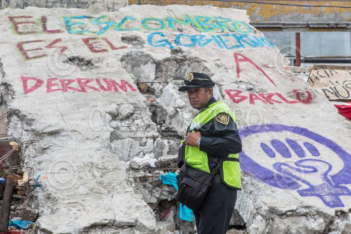 CIUDAD DE MÉXICO, 06OCTUBRE2017.- "El escombro es el gobierno, a derrumbarlo", dice una pinta en las ruinas que quedaron del edificio colapsado en las calles Chimalpopoca y Bolívar por el sismo de magnitud 7.1 del pasado 19 de septiembre. El lote esta resguardado por policías capitalinos. FOTO: TERCERO DÍAZ /CUARTOSCURO.COM
