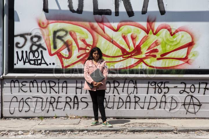 CIUDAD DE MÉXICO, 06OCTUBRE2017.- "Memoria histórica 1985 - 2017 costureras solidaridad", dice una pinta en los alrededores del edificio colapsado por el sismo de magnitud 7.1 del pasado 19 de septiembre. Una joven observa desde la banqueta el lote que hoy en día es custodiado por policías capitalinos. FOTO: TERCERO DÍAZ /CUARTOSCURO.COM