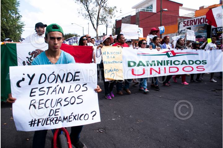 CIUDAD DE MÉXICO, 19NOVIEMBRE2017.- Los residentes del Multifamiliar Tlalpan que resultaron afectados por el sismo del 19 de septiembre, salieron a protestar por la indiferencia sobre su falta de viviendas, pues desde hace dos meses están viviendo en el estacionamiento del complejo habitacional. Las consignas gritan repudio hacia el programa de crédito para reconstruir sus casas, sugerido por el estado. Otra de las exigencias es el esclarecimiento de los recursos donados en la campaña #FuerzaMéxico FOTO: JESÚS VERDUGO /CUARTOSCURO.COM