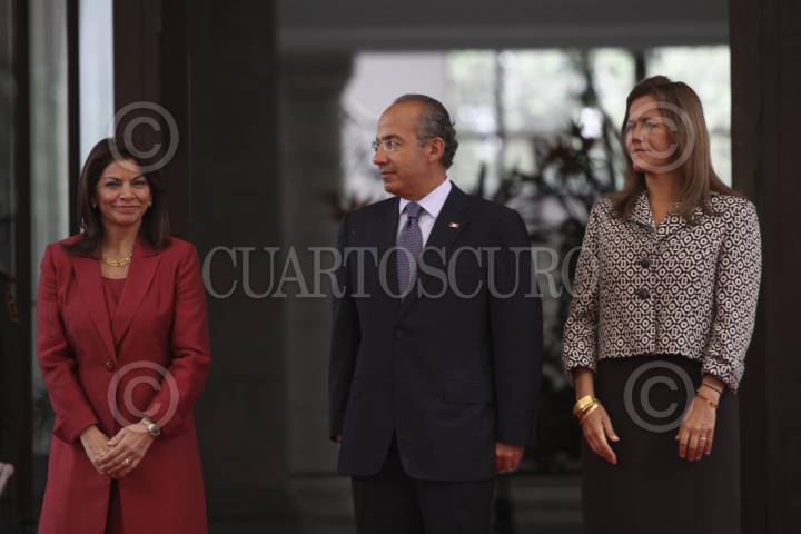 MÉXICO, D.F., 22AGOSTO2011.- Laura Chinchilla, presidenta de Costa Rica; Felipe Calderón Hinojosa, presidente de México; y Margarita Zavala de Calderón, durante la ceremonia oficial de bienvenida con motivo de la visita de Estado de la presidenta de la República de Costa Rica. FOTO: IVÁN STEPHENS/CUARTOSCURO.COM