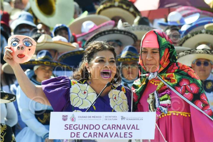 CIUDAD DE MÉXICO, 08FEBRERO2025.- Clara Burgada, jefa de gobierno, encabezó el arranque del segundo desfile de comparsas de chinelos y huehuenches que partió del Monumento a la Revolución rumbo al zócalo capitalino. FOTO: MARIO JASSO/CUARTOSCURO.COM