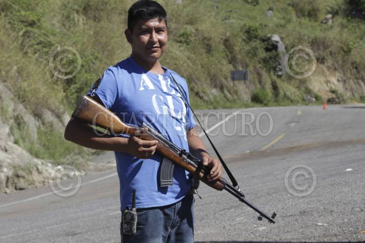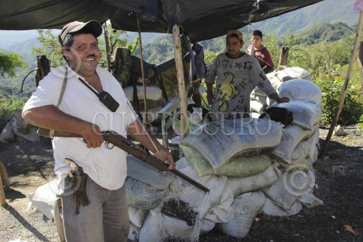 CHINICUILA, MICHOACÁN. 19NOVIEMBRE2013. Comuneros de Huizontla, municipio de Chinicuila, solicitaron a las autoridades federales y estatales frenar la delincuencia organizada, pues toda esa región de sierra-costa ha sido víctima de extorsiones y amenazas. "No pedimos dinero ni programas sociales, sólo que nos dejen trabajar en paz". Comentaron que viven al sur de Coalcomán y colindan con el municipio de Aquila, en una zona olvidada y aislada, por lo que el pasado 28 de mayo decidieron sumarse a los grupos de autodefensa. Vigilan armados las 24 horas, que los asesoró la guardia comunitaria de la cabecera municipal de Villa Victoria, del municipio de Chinicuila. FOTO: JUAN JOSÉ ESTRADA SERAFÍN /CUARTOSCURO.COM