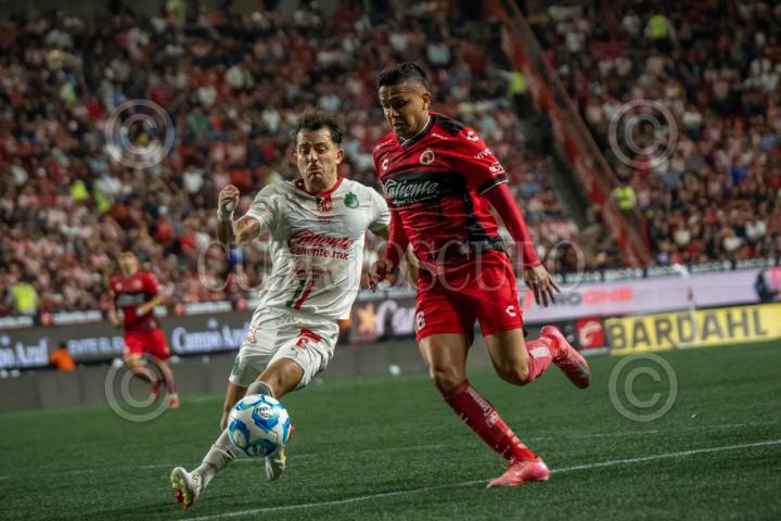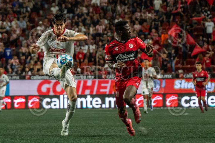 TIJUANA, BAJA CALIFORNIA, 22AGOSTO2015.-Adonis Preciado disputa el balón con Miguel Tapias durante el encuentro entre Xoloitzcuintles de Tijuana y Chivas del Guadalajara que terminó empatado 3-3 la noche de este viernes en duelo correspondiente a la jornada 6 del torneo Apertura 2025 de la Liga MX, disputado en el Estadio Caliente.FOTO OMAR MARTÍNEZ/ CUARTOSCURO.COM