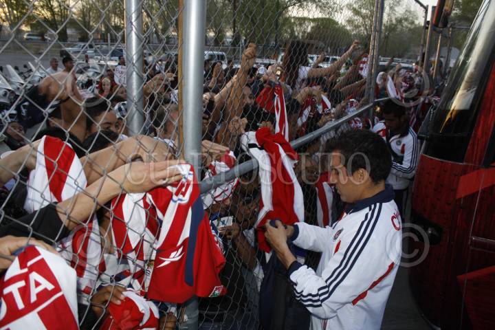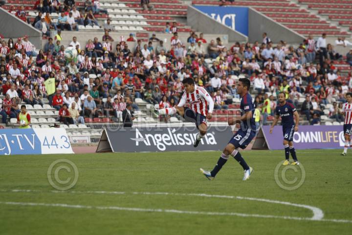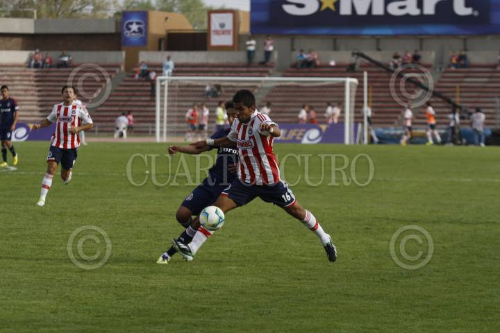 CIUDAD JUÁREZ, CHIHUAHUA, 20MARZO2013.- El encuentro entre Chivas del Guadalajara y Chivas USA concluyó en punto de las 19:00 horas con empate al dejar el marcador tres golpes por tres, en la cancha del estadio olímpico Benito Juárez. Con el estadio casi vacío el encuentro inició en punto de las 17:00 horas en donde el equipo estadounidense dominaba el juego hasta el minuto 17 cuando Jesús Sánchez fue quien se encargó de abrir el marcador al anotar el primer gol. Posteriormente Luis Morales se encargó de dejar el dos por cero al minuto 21, pero no pasó mucho cuando al minuto 39 Giovanni Casillas con el número 14 anotó el gol para abrir el marcador a su favor. Otro gol entró en la red de las Chivas del Guadalajara lo que deja el marcador dos a dos, luego de que se marcara penalti el cual metió el jugador José Correa al minuto 17 del segundo tiempo. La tercera anotación por parte del equipo de las Chivas USA entró en la red del rebaño mexicano al minuto 31 por parte de Julio Morales al quedar solo frente al arquero. Para terminar el encuentro Erick Torres anotó el último gol para dejar el marcador tres por tres al minuto 41. FOTO: NACHO RUÍZ /CUARTOSCURO.COM