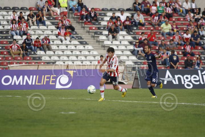 CIUDAD JUÁREZ, CHIHUAHUA, 20MARZO2013.- Termina el primer tiempo del encuentro entre Chivas del Guadalajara contra Chivas USA, en donde hasta ahora el marcador es de dos goles por uno en el estadio olímpico Benito Juárez. El delantero del equipo Chivas de Guadalajara Jesús Sánchez fue quien se encargó de abrir el marcador al anotar el primer gol al minuto 17 del primer tiempo. Para el minuto 21 el segundo gol cayó por parte del rebaño y se encargó de anotarlo Luis Morales, lo que causó que la afición se levantara de las tribunas para celebrar. Pero Giovanni Casillas con el número 14 en su playera del equipo USA de Chivas anotó el primer gol, lo que dejó el marcador dos a uno. FOTO: NACHO RUÍZ /CUARTOSCURO.COM