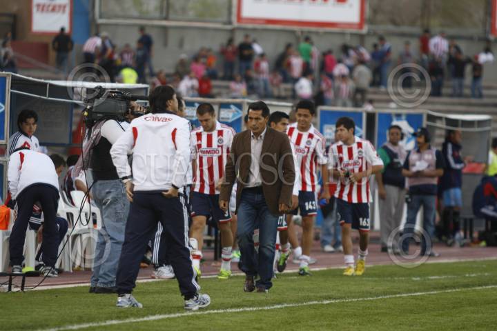 CIUDAD JUÁREZ, CHIHUAHUA, 20MARZO2013.- El encuentro entre Chivas del Guadalajara y Chivas USA concluyó en punto de las 19:00 horas con empate al dejar el marcador tres golpes por tres, en la cancha del estadio olímpico Benito Juárez. Con el estadio casi vacío el encuentro inició en punto de las 17:00 horas en donde el equipo estadounidense dominaba el juego hasta el minuto 17 cuando Jesús Sánchez fue quien se encargó de abrir el marcador al anotar el primer gol. Posteriormente Luis Morales se encargó de dejar el dos por cero al minuto 21, pero no pasó mucho cuando al minuto 39 Giovanni Casillas con el número 14 anotó el gol para abrir el marcador a su favor. Otro gol entró en la red de las Chivas del Guadalajara lo que deja el marcador dos a dos, luego de que se marcara penalti el cual metió el jugador José Correa al minuto 17 del segundo tiempo. La tercera anotación por parte del equipo de las Chivas USA entró en la red del rebaño mexicano al minuto 31 por parte de Julio Morales al quedar solo frente al arquero. Para terminar el encuentro Erick Torres anotó el último gol para dejar el marcador tres por tres al minuto 41. En la imagen el técnico de Chivas del Guadalajara Benjamín Galindo. FOTO: NACHO RUÍZ /CUARTOSCURO.COM