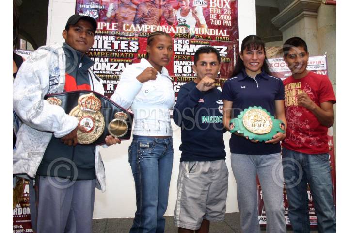 OAXACA, OAXACA 25FEBRERO2009.-Román “Chocolatito” González, Paulina Cardona, Francisco Rosas, Ana Maria Torres y Eric Ramírez contendientes para el próximo triple campeonato Mundial que se llevara acabo en esta ciudad en el auditorio Guelaguetza. FOTO: MAX NÚÑEZ/CUARTOSCURO.COM