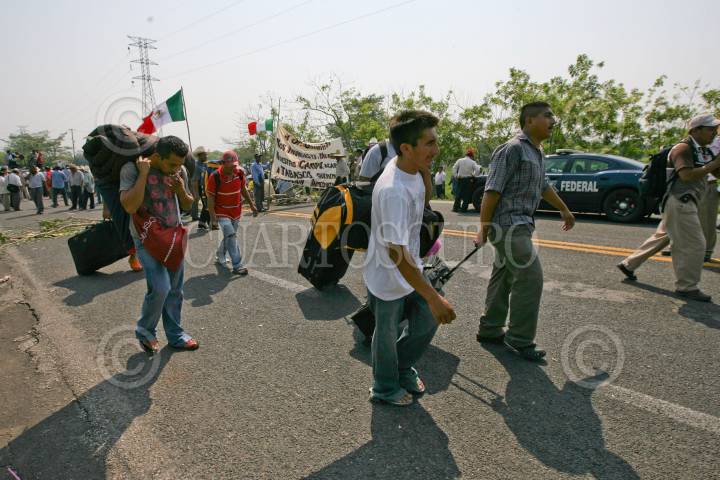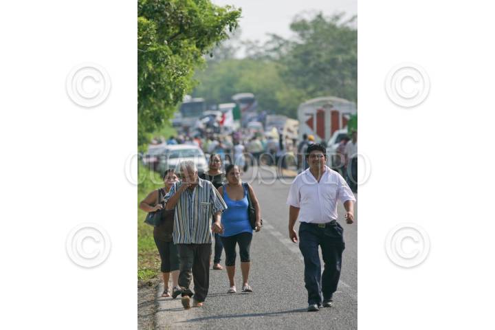 VILLAHERMOSA, TABASCO, 12MAYO2011.- El cierre de la carretera federal Villahermosa-Centla a la altura de la entrada Tamulte de las Sabanas causa gran trafico vehícular en espera de que esta sea abierta al paso de las unidades motrices, ya que muchos conductores tienen como destino la ciudades de Campeche, Mérida o Cancún. Así mismo personas que viajan sobre esta carretera tienen que complementar su tramo y realizarlo caminando con sus maletas. FOTO: MARCO POLO GUZMÁN HERNÁNDEZ/CUARTOSCURO.COM
