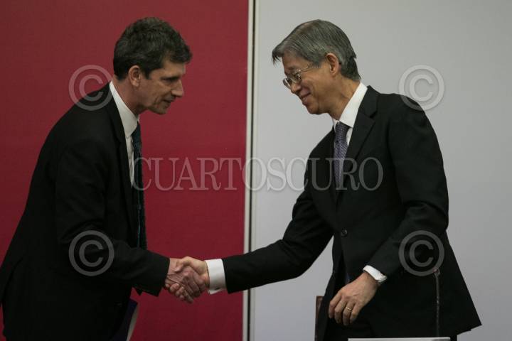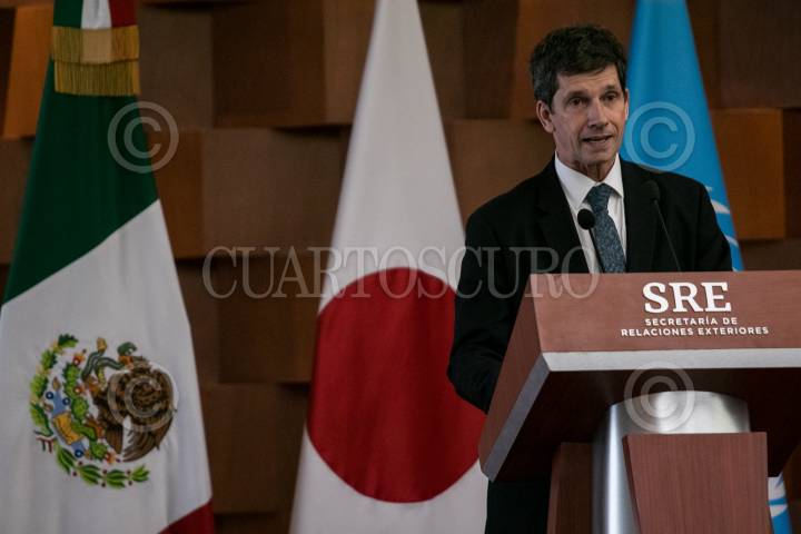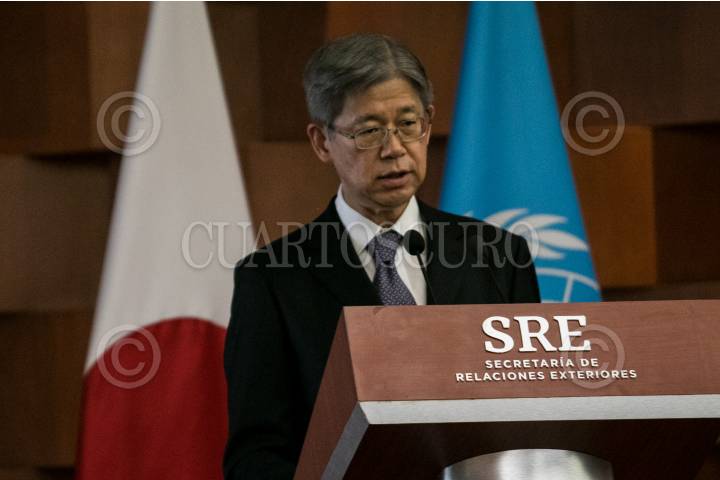 Yasushi Takase, embajador de Japón en México, durante la firma de convenio de colaboración entre el país y la embajada japonesa para el mejoramiento de la atención migratoria.