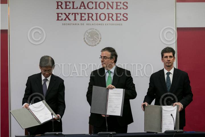 Yasushi Takase, embajador de Japón en México, Marcelo Ebrard, secretario de Relaciones Exteriores, y Christopher Gascon, representante de la Organización Internacional para las Migración (OIM, durante la firma de convenio de colaboración entre el pa