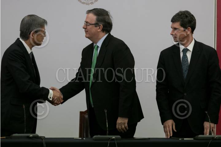 Marcelo Ebrard, secretario de Relaciones Exteriores, durante la firma de convenio de colaboración entre el país y la embajada japonesa para el mejoramiento de la atención migratoria.